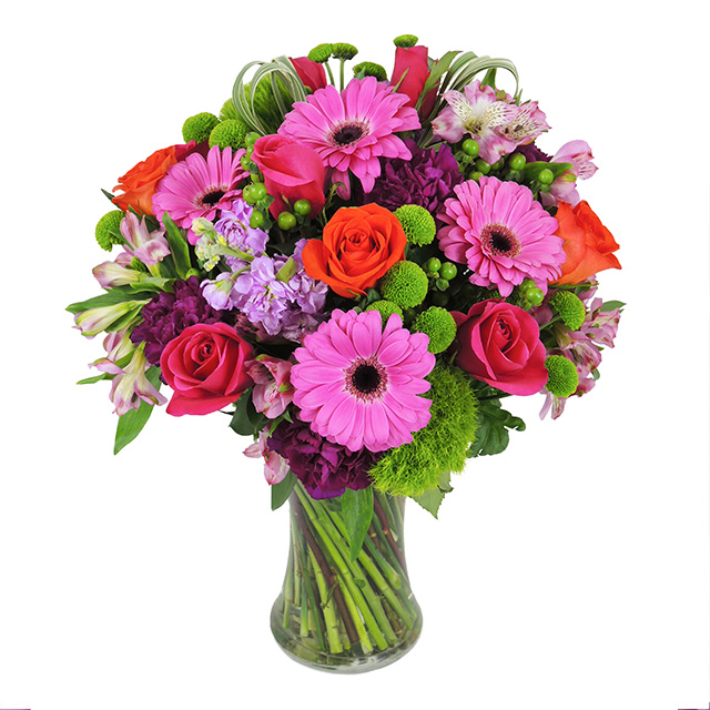 Jubilations abound with the Celebrating Mom Bouquet! Applaud your Mom with this stunning collection of vibrant orange Roses, pink Gerbera, Carnations, Alstroemeria and many more assorted blooms arranged in a clear gathering Vase. This bouquet is the ideal expression of appreciation and Love.