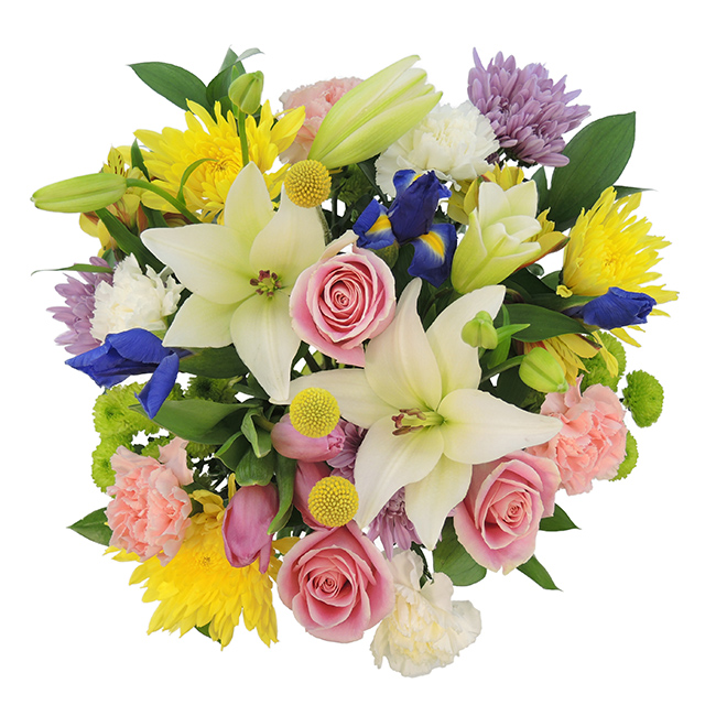 This traditional pastel Easter bouquet is a wonderful way to express warmest wishes to family and friends. This Easter vase arrangement consists of carnations, roses, asiatic lilies, poms, craspedia, alstroemeria, spider and tulips along with some greenery. Your flowers will arrive in a box along with an Apple Green Rose vase.